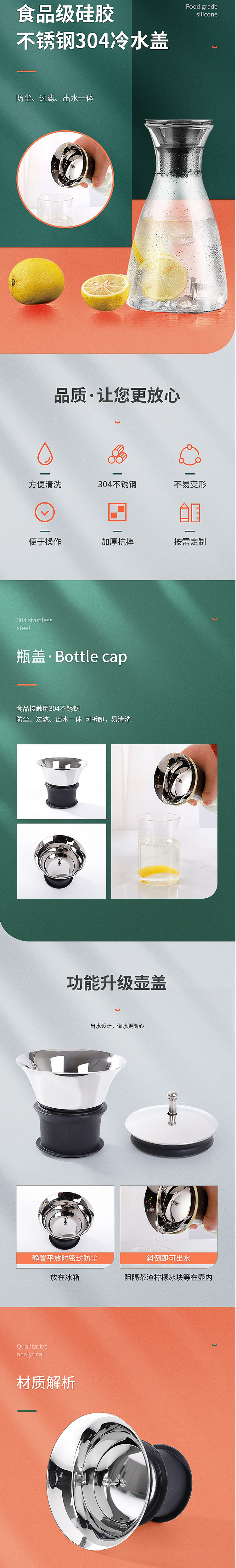 食品接觸用304不銹鋼。防塵、過濾、出水一體可拆卸,易清洗。出水設計,倒水更隨心。靜置平放時密封防塵,斜倒即可出水。放在冰箱,阻隔茶渣檸檬冰塊等在壺內。硅膠,不銹鋼蓋,內設硅膠圈,不易掉落。
