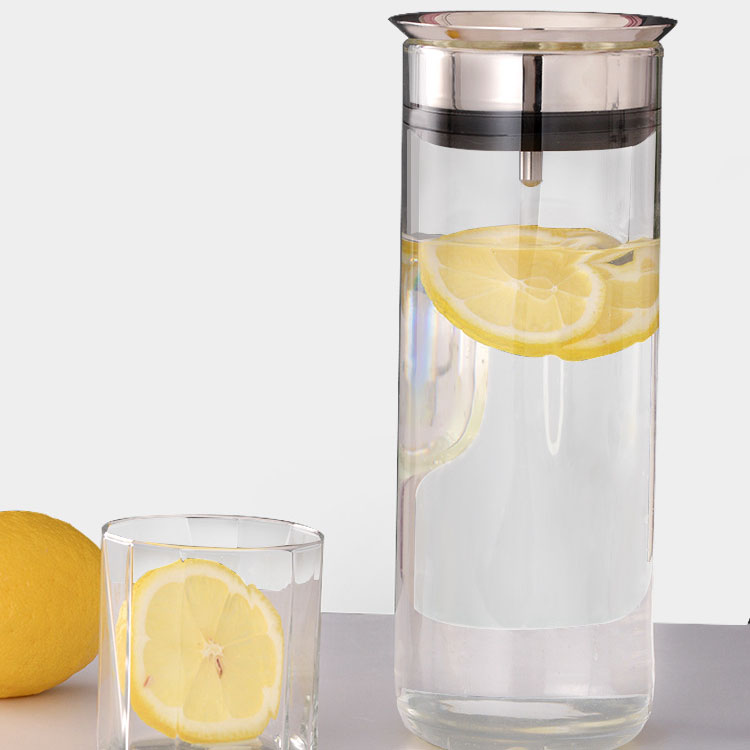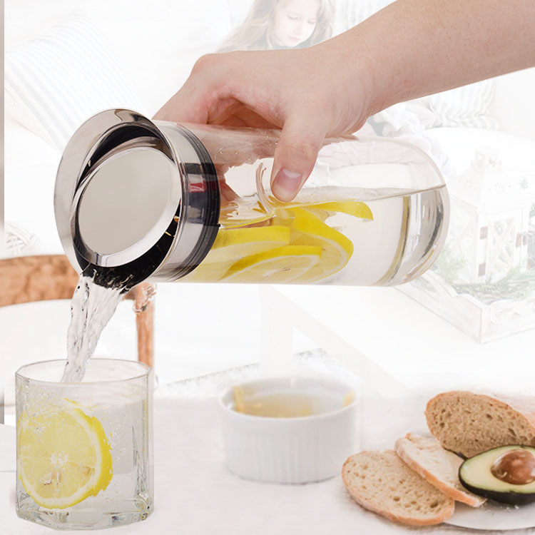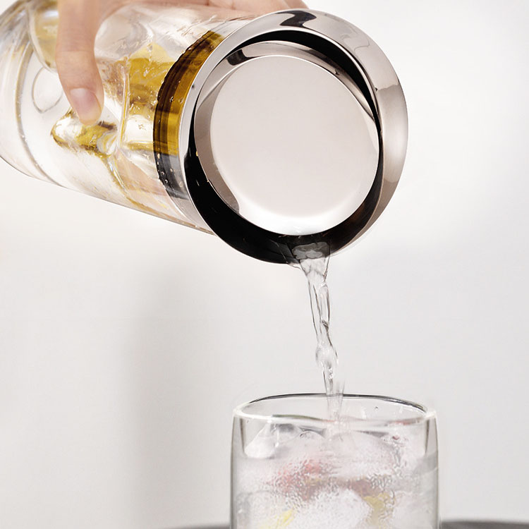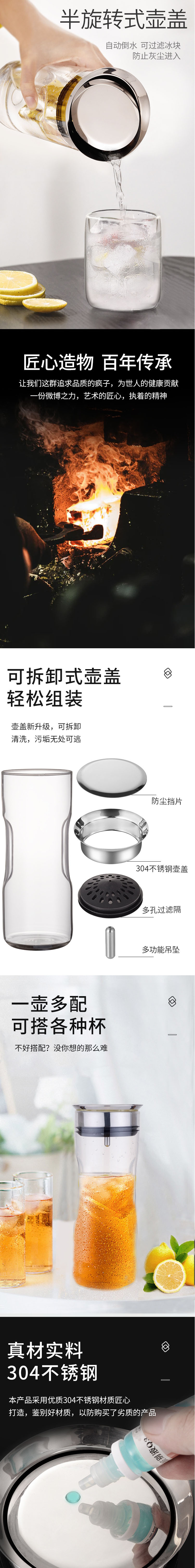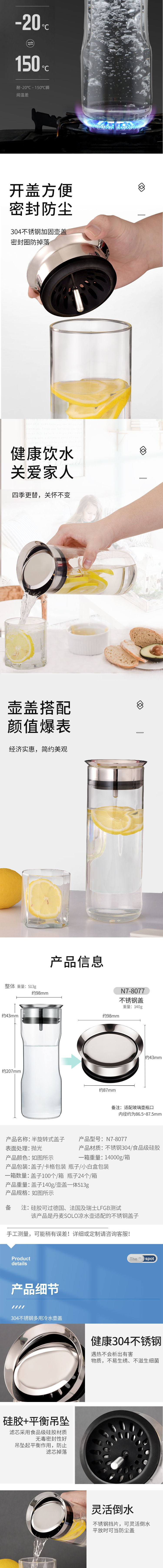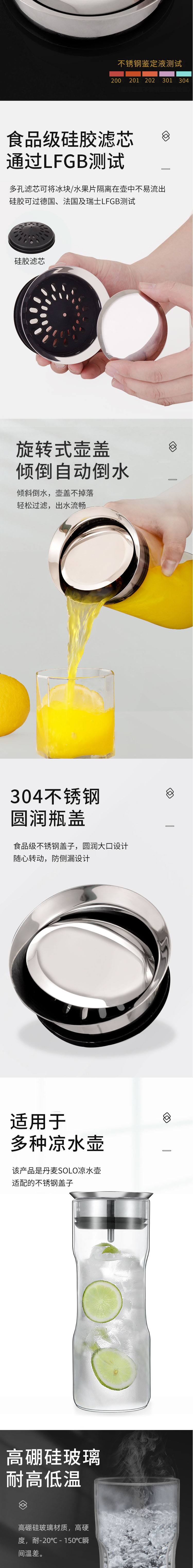 傾倒自動倒水,傾斜倒水,壺蓋不掉落,輕松過濾,出水流暢。304不銹鋼圓潤瓶蓋:不銹鋼蓋子,圓潤大口設計,隨心轉動,防側漏設計。適用于多種涼水壺,該產品是SOLO涼水壺,適配的不銹鋼蓋子。高硼硅玻璃,耐高低溫,高硼硅玻璃材質,高硬度,耐-20°C- 150°C瞬間溫差。開蓋方便,密封防塵,304不銹鋼加固壺蓋,密封圈防掉落。304不銹鋼,遇熱不會析出有害物質,不易生繡、不滋生。硅膠+平衡吊墜,濾芯采用硅膠材質,密封性好。吊墜起平衡作用,防止濾芯掉落。靈活倒水,不銹鋼擋片,可靈活倒水,平放時可當防塵蓋。
