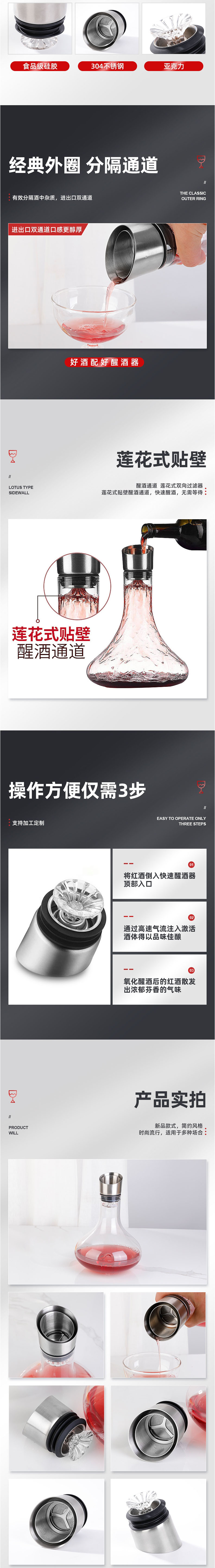 蓮花式貼壁醒酒通道:新品款式,簡約風格,時尚流行,適用于多種場合。12股蓮蓬式引酒器,讓紅酒如瀑布流下充分醒酒,使用材質硅膠。硅膠材質,柔軟易清洗,不易有異味。不銹鋼過濾醒酒器頭,升級牢固亞克力板鏈接整體更牢固,更實用。分拆式設計,可拆開清洗,清洗更干凈,清洗更便捷,使用更放心。經典外圈分隔通道,分隔酒中雜質,進出口雙通道。蓮花式貼壁,醒酒通道蓮花式雙向過濾器,蓮花式貼壁醒酒通道,快速醒酒,無需等待。